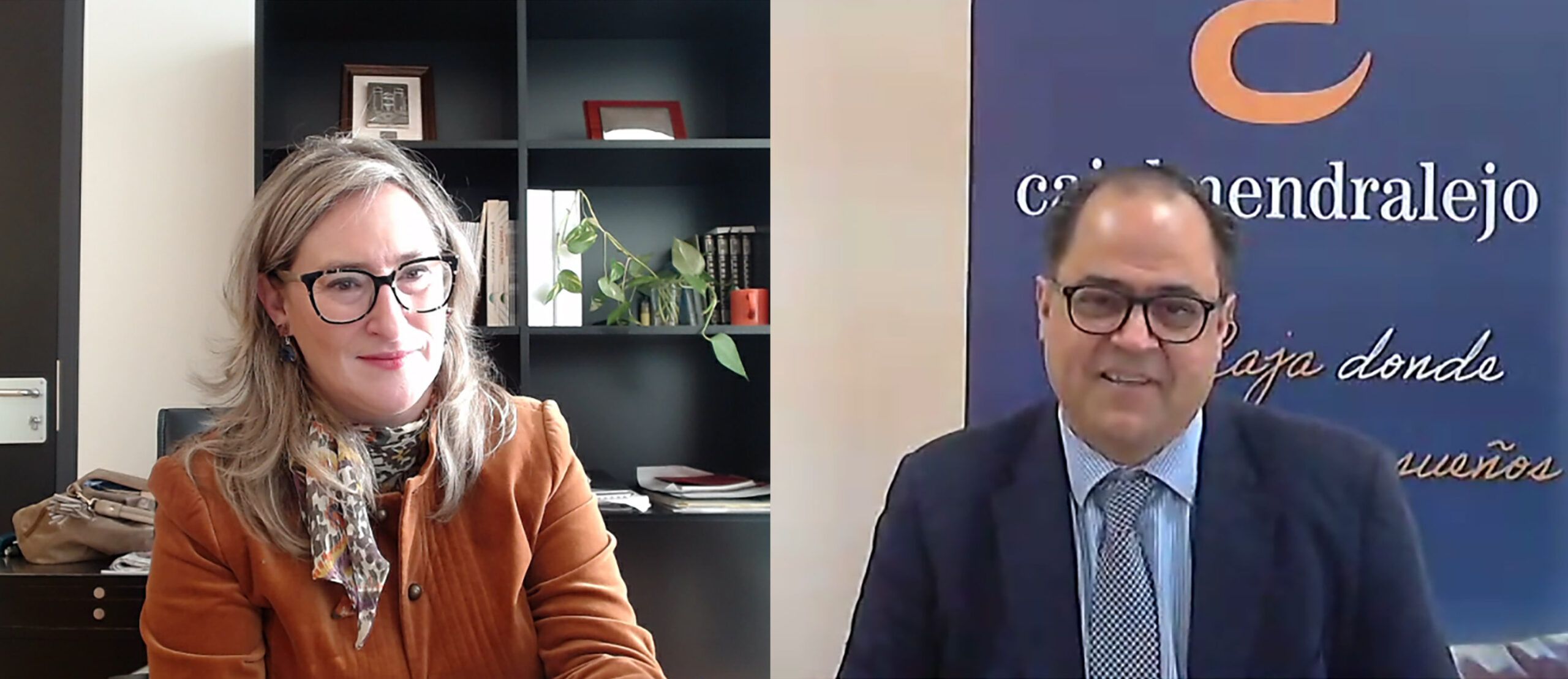 La directora general de FEVAL-Institución Ferial de Extremadura, Susana Cortés, y el director de la Unidad de Negocio de Cajalmendralejo, Pablo Llamas, han firmado hoy el acuerdo de patrocinio de AGROEXPO 2021.