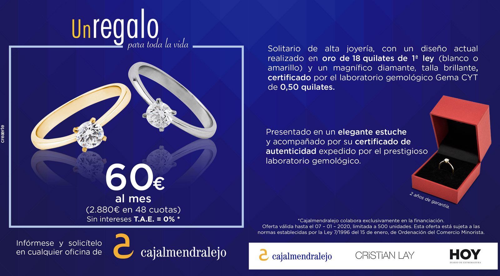 Cajalmendralejo le ofrece la posibilidad de adquirir, en colaboración con el Diario HOY, un solitario de alta joyería diseñado y comercializado por Cristian Lay, con un diseño actual realizado en oro 18 quilates 1a ley (blanco o amarillo) y un magnífico diamante, talla brillante, certificado por el laboratorio gemológico GEMACYT de 0,50 quilates.